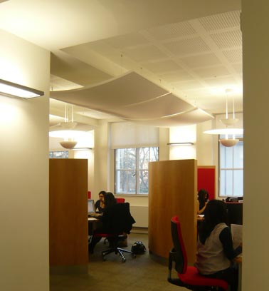 Each was treated differently. In the approach areas and bookstacks, we used a rubber floor covering - quite reverberant - and exposed the high plaster ceilings, uplighting them to emphasise the apparent height of the space. Here, although there was plenty of movement and activity, we were maximising reverberation to encourage a self conscious quieting-down of behaviour. In the group study areas, we created semicircular free standing partitions, highly reflective on the convex, outer side (veneered, varnished timber), and highly absorbent on the concave, inner side (fabric over mineral wool), within which the groups were to sit. Rather than taking the partitions to full height - the sense of light, openness and connected-ness was important - we treated the ceiling with absorbent materials (perforated plaster with an air gap behind) and floated 'acoustic clouds' (curved panels of compressed mineral wool over a steel plate, suspended on wires from the ceiling) above the space. The combination of these created an almost perfectly absorbent ceiling, an 'artificial sky'. With no reflections from above, the sound in these booths is markedly different from the main space, and students can converse at a normal level without disturbing other groups. Again, we uplit the acoustic clouds, taking advantage of their space to diffuse the light and drawing attention of users to the strange shapes which create such an aura of calm. |