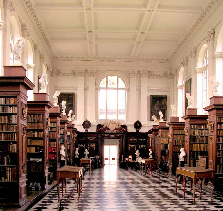 The Wren Library at Trinity: Note the high ceiling, the marble floor, and the difference in acoustic between the lower and upper parts of the room. For sale see the figure at the right hand of the door. |
