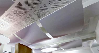 Each was treated differently. In the approach areas and bookstacks, we used a rubber floor covering - quite reverberant - and exposed the high plaster ceilings, uplighting them to emphasise the apparent height of the space. Here, although there was plenty of movement and activity, we were maximising reverberation to encourage a self conscious quieting-down of behaviour. In the group study areas, we created semicircular free standing partitions, highly reflective on the convex, outer side (veneered, varnished timber), and highly absorbent on the concave, inner side (fabric over mineral wool), within which the groups were to sit. Rather than taking the partitions to full height - the sense of light, openness and connected-ness was important - we treated the ceiling with absorbent materials (perforated plaster with an air gap behind) and floated 'acoustic clouds' (curved panels of compressed mineral wool over a steel plate, suspended on wires from the ceiling) above the space. The combination of these created an almost perfectly absorbent ceiling, an 'artificial sky'. With no reflections from above, the sound in these booths is markedly different from the main space, and students can converse at a normal level without disturbing other groups. Again, we uplit the acoustic clouds, taking advantage of their space to diffuse the light and drawing attention of users to the strange shapes which create such an aura of calm. |